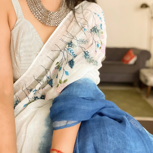 Crafted in pure handwoven linen. The sari is 5.7 meters in length & it does not come with a running blouse piece. The blouse can be purchased separately.