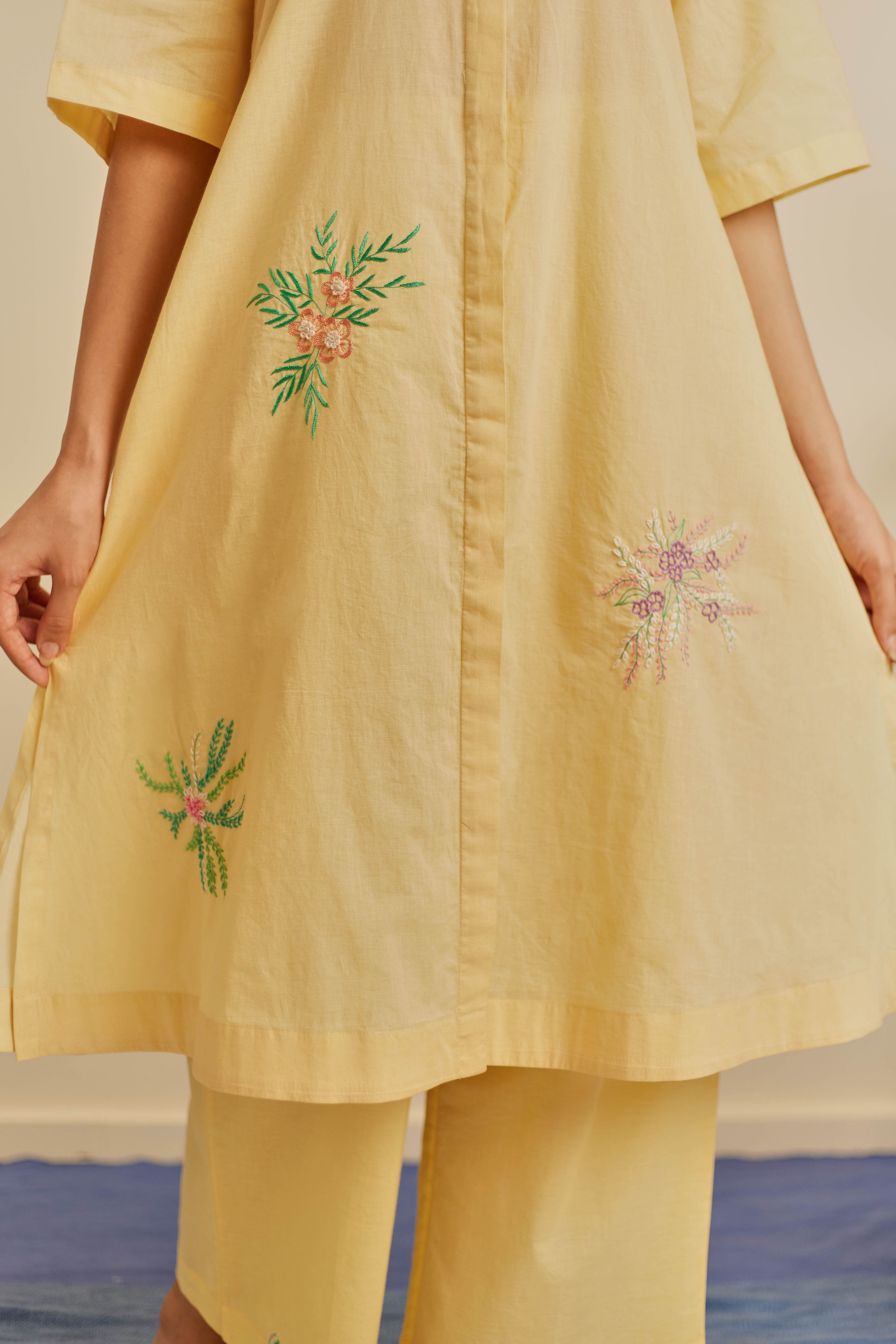 Embrace sophistication in our cream cotton kurta set. This A-line ensemble boasts a sleek collar and placket, complemented by 3/4th A-line raglan sleeves adorned with exquisite placement embroidery. The straight-fit pants, enhanced with corner embroidery, seamlessly blend smart event elegance with polished office allure.
