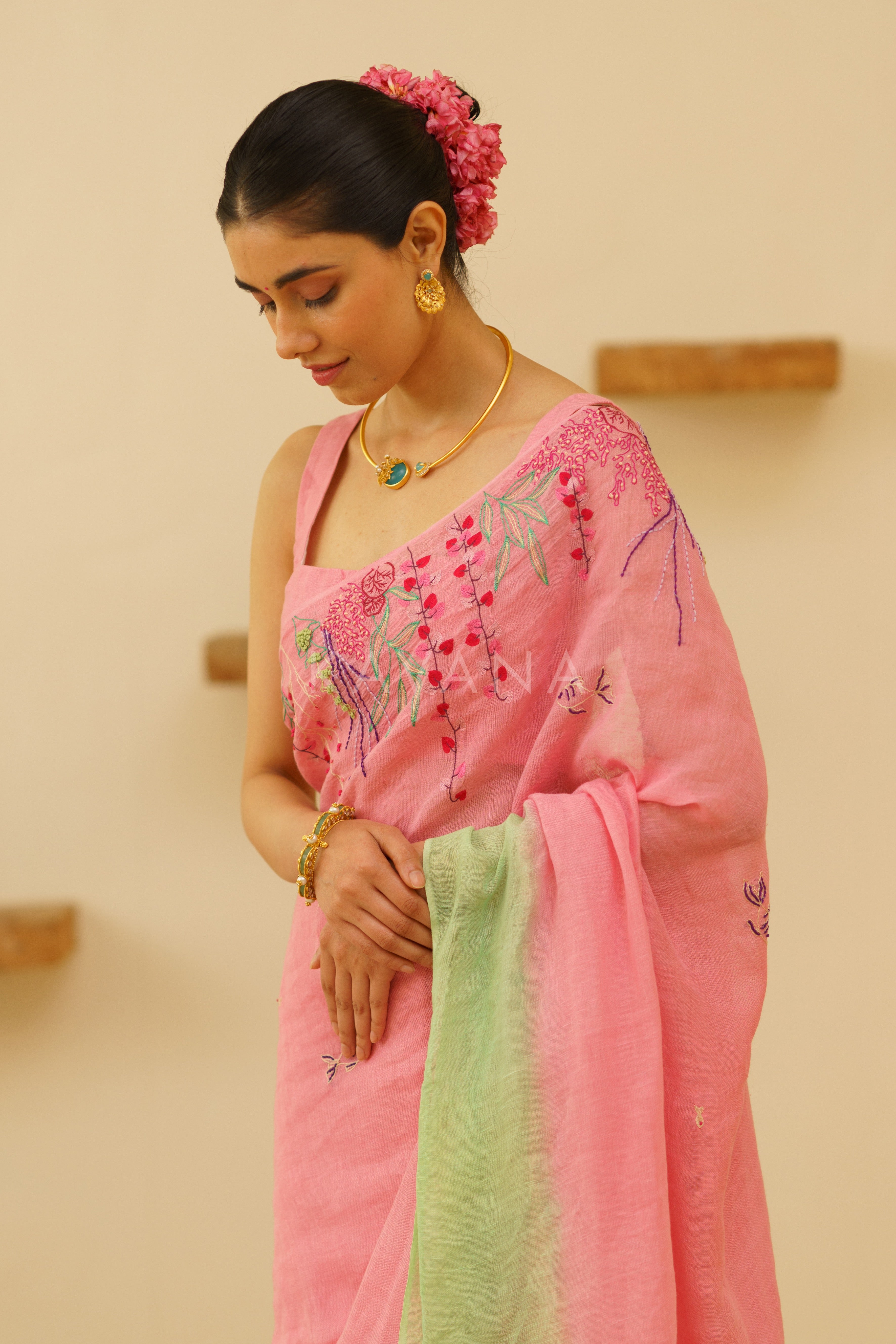 Introducing our charming pink linen saree with elegant embroidery on top and a soothing ombre green border, perfect for summer occasions. Effortlessly blending style and comfort, it's a must-have for the season. Elevate your summer look with this stunning ensemble, designed to make you feel cool and beautiful.